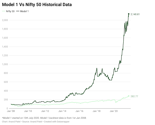 If you had invested INR 100 in the Nifty 50 Index on 1st Jan 2008, it would have grown to INR 283 on 24th Sep 2021, which translates to a 7% CAGR. The same INR 100, invested in Model 1, would have returned a whopping INR 2140, which is 25% CAGR.