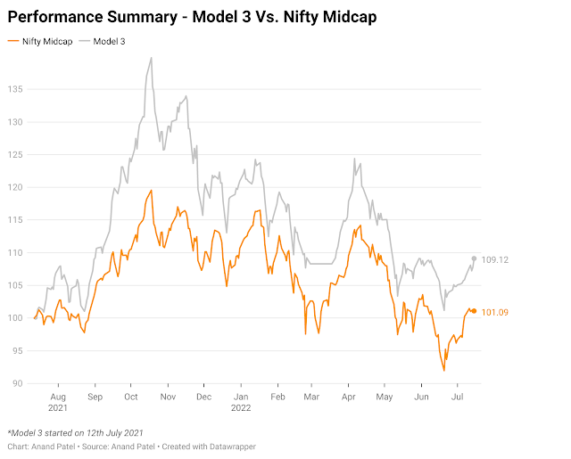 From July 12th, 2021, the Model 3 is up +9%, compared to 1% for the Nifty Midcap Index.